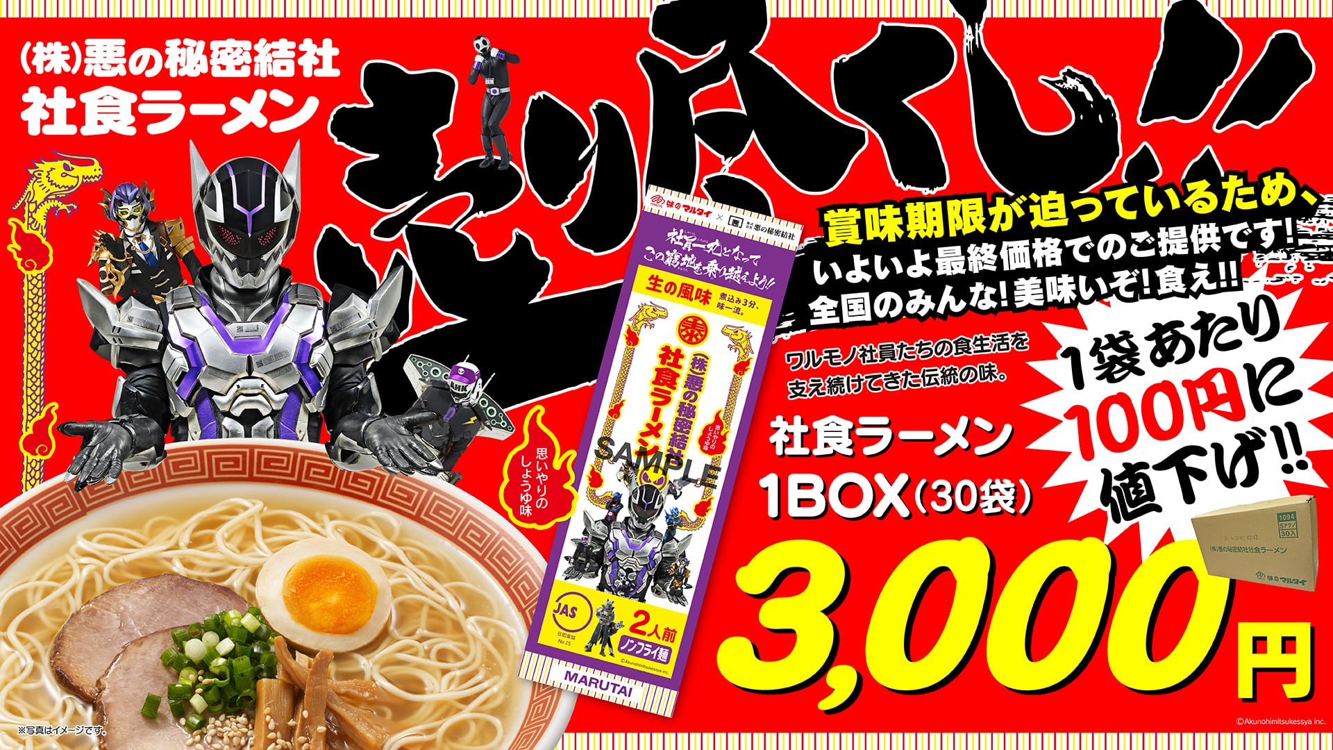 (株)悪の秘密結社特製社食ラーメンが消費期限(2026年4月10日)に追われて最終価格で帰ってきた!! 育ち盛りのあなたにピッタリの夢の1ケースセット!!全国のみんな!!食べて!! 【販売期間】 2026年1月16日(金)〜2026年3月10日(火) ※最終出荷は2026年3月13日(金)を予定しております。 【発送方法】 飛脚宅配便80サイズ 1ケースセットに限りオリジナルロゴ入りの箱に入れてお届けします! ※他商品と同梱不可 【発送について】 毎週金曜日の発送になります ご注文のタイミングにより発送日が異なりますので、あらかじめご確認ください。 ・木曜日18:59までのご注文:翌日(金曜日)発送 ・木曜日19:00以降のご注文:翌週金曜日発送 【ご注意事項】 ※別途送料がかかります ※1会計で1ケースまで購入できます。 ※在庫が無くなり次第、販売終了となります。 ※ご注文の日時によっては、発送までにお時間をいただく場合がございます。詳しくは【発送について】をご確認ください。 ※商品の不備があった場合のみ、交換またはキャンセル対応をさせていただきます。